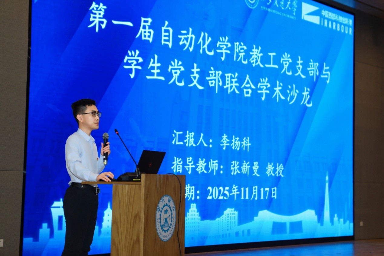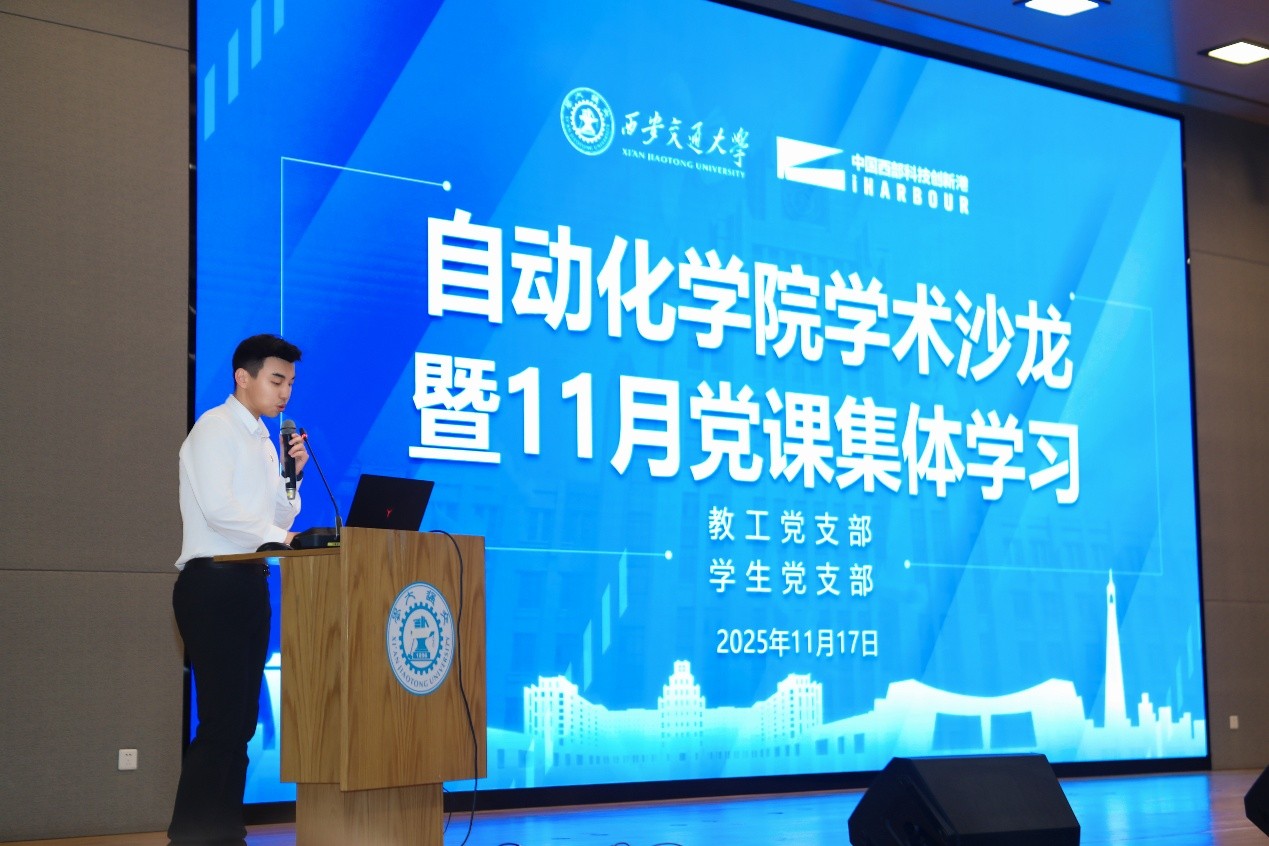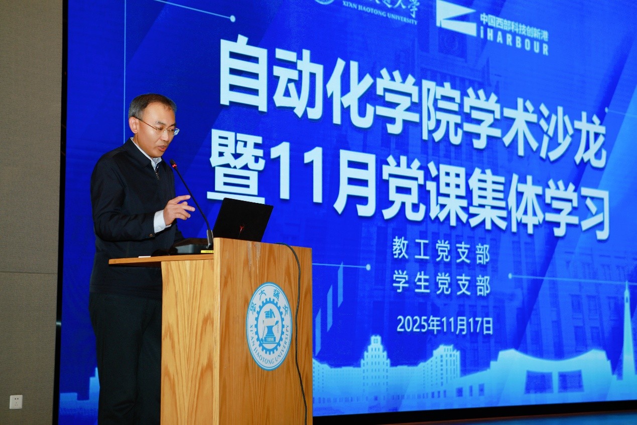 2025年11月17日下午,电信学部自动化学院学术沙龙暨11月党员集体学习活动在西安交通大学创新港校区5-2W204圆满举行。电信学部党委副书记史锋、自动化学院院长杨清宇、自动化学院党总支副书记杨静、自动化学院教工党支部书记安豆、新疆大学智能科学与技术学院学术副院长王聪等领导嘉宾,及自动化学院各教工党支部代表出席活动;自动化学院全体研究生党员、预备党员、入党积极分子及师生代表共同参与。会议由电信学部博检测与自控党支部书记杨星宇主持。