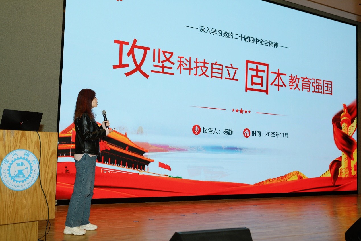 会议第四项、学院党总支副书记杨静带领全体党员深入学习党的二十届四中全会精神,开展专题为“攻坚科技自立、固本教育强国”的党课培训。杨静教授强调,当前科技发展与国家战略需求密切相关,自动化学院党员应以更高政治站位、更严标准要求自己,将科研追求与国家重大需求紧密相连。她指出,党员要把日常科研、学习和工作作为践行初心使命的重要阵地,用行动塑造党员形象,用成果体现时代担当。