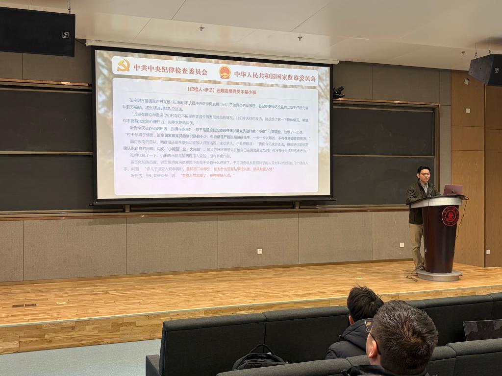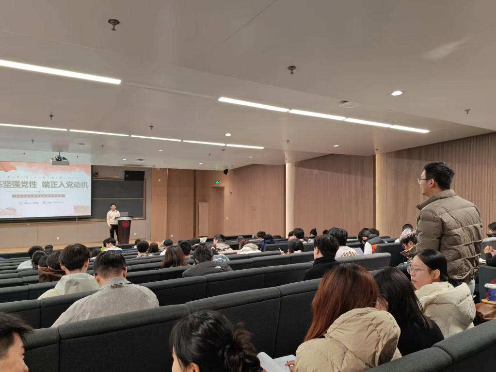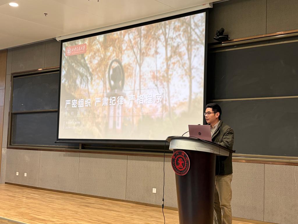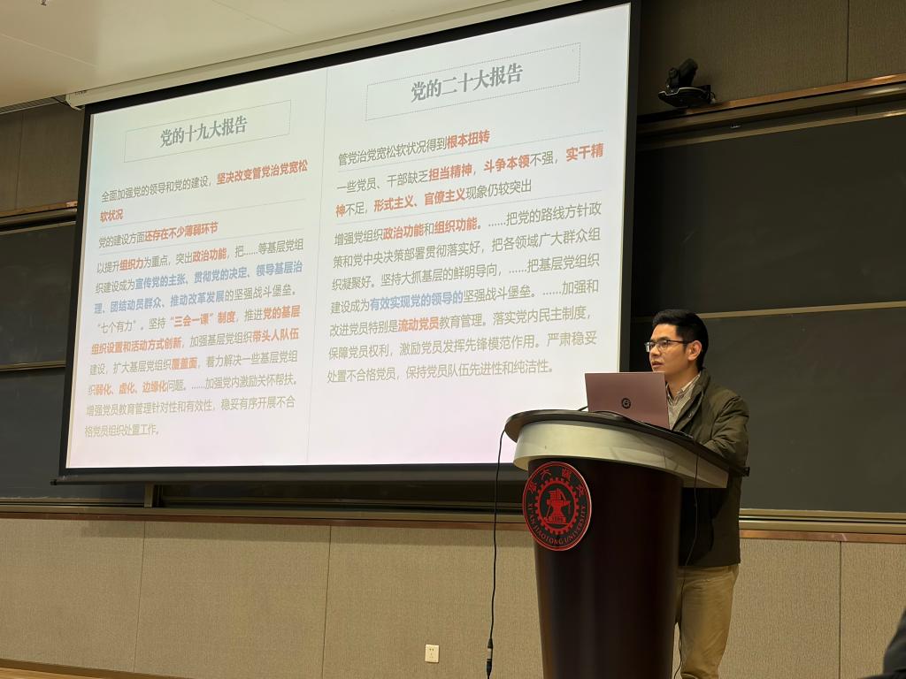 党委组织部杨夫腾老师以“严密组织 严肃纪律 严格程序”为主题,强调发展党员的重要性,带领同学们解读十九大报告、二十大报告中党的建设相关内容,为同学们解答了党员发展过程中可能出现的问题。