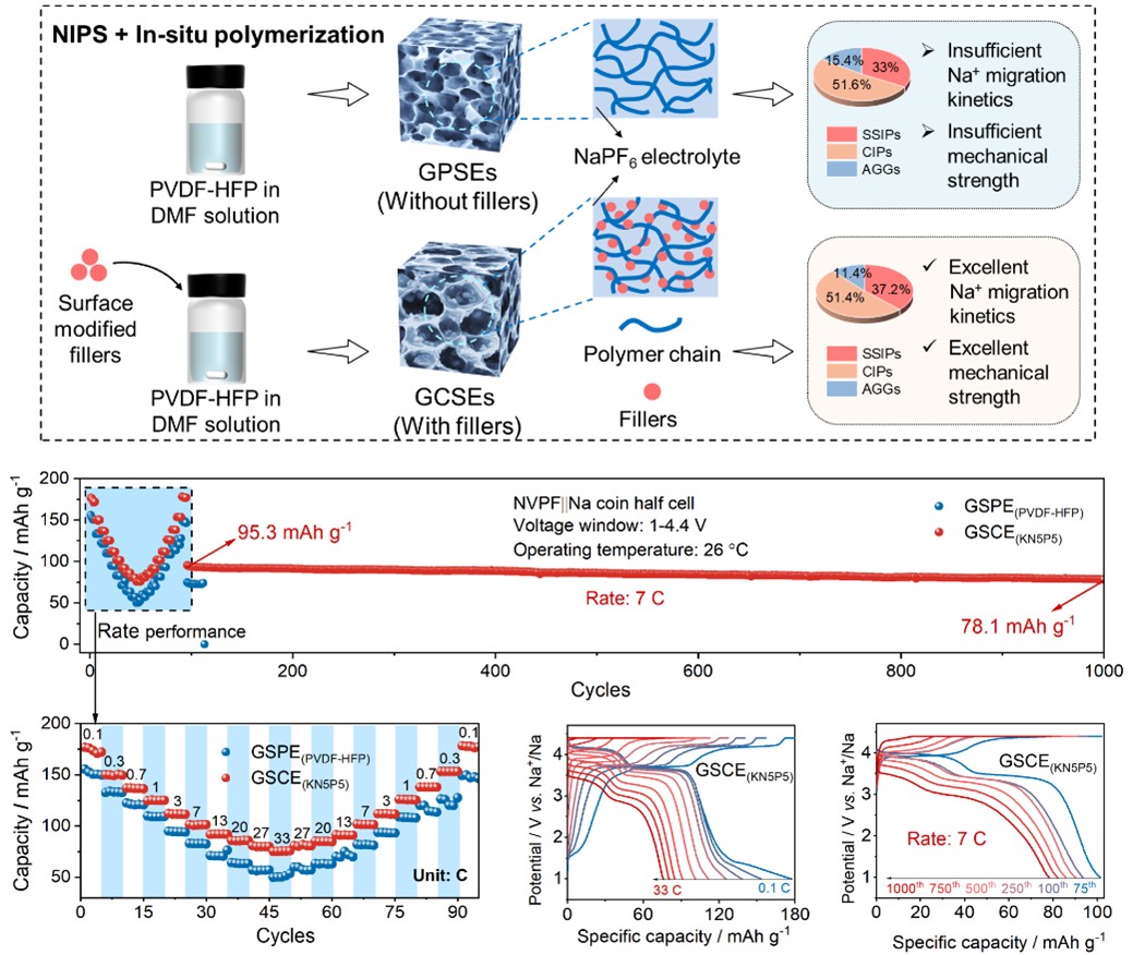 凝胶复合固态电解质(GCSEs)兼具高离子电导率和良好的界面相容性,在固态钠金属电池中具有巨大的应用潜力。然而,GCSEs中磷硅酸锆钠(NZSP)填料含量低和普遍存在的团聚现象限制了其有效利用,显著降低了离子传输效率和结构一致性,从而影响电池的倍率特性和长期稳定性。