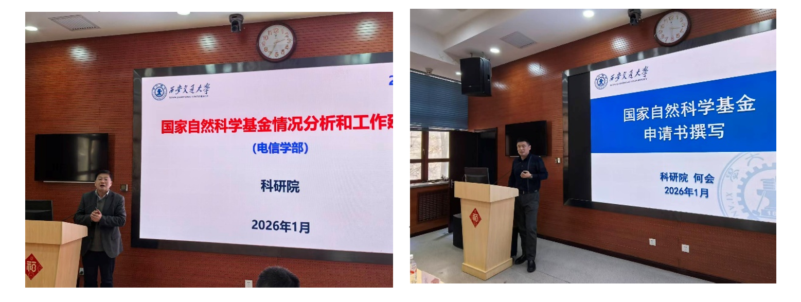 为扎实推进2026年国家自然科学基金申报工作,充分调动教师及科研人员的申报热情,全面提升基金申报质量与命中率,1月5日下午,电信学部携手科研院于兴庆校区彭康楼218会议室成功举办国家自然科学基金动员培训会。科研院副院长刘永忠教授、科研处副处长何会出席会议并指导工作,学部特邀电子学院副院长曹猛教授、信通学院王晓凯教授、电子学院董国华教授担任主讲嘉宾,学部各学院教师代表、科研骨干共计60余人参会,会议由学部副主任高峰教授主持。