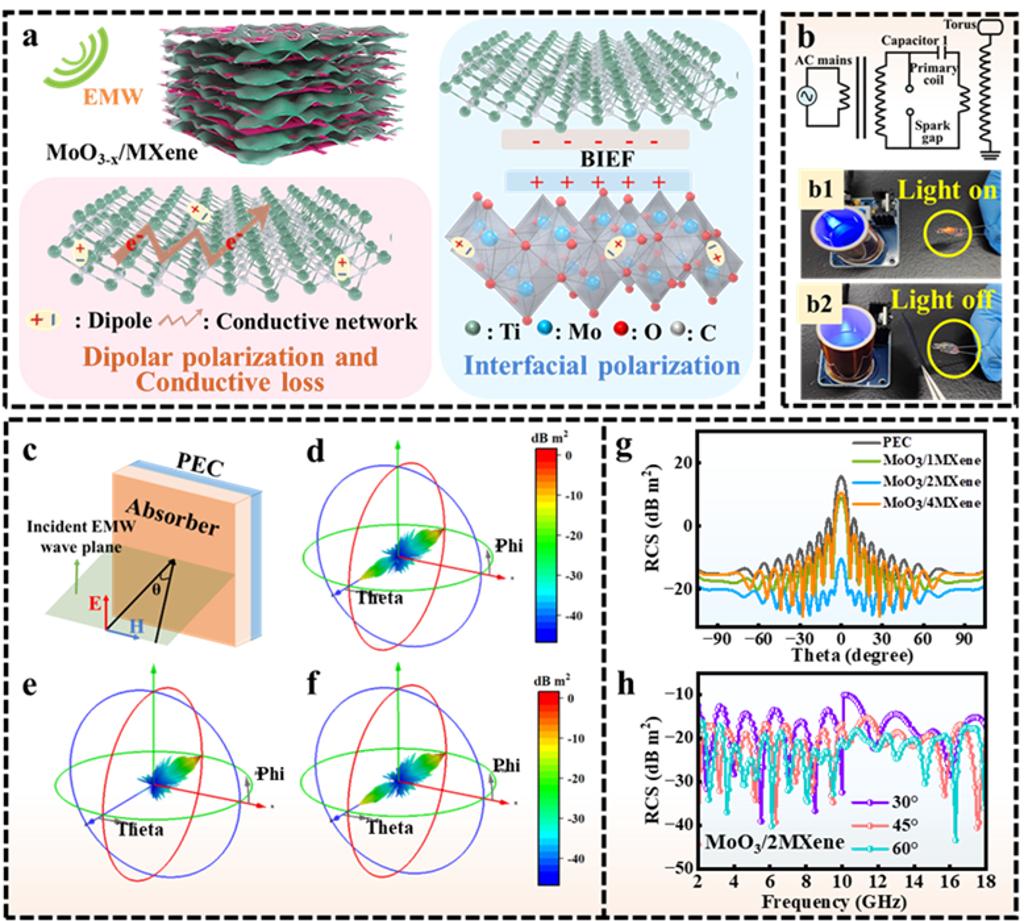 对此,西安交通大学电子科学与工程学院电子陶瓷与器件教育部重点实验室、陕西省先进储能电子材料与器件工程研究中心阙文修教授团队在国际著名期刊《先进功能材料》(Advanced Functional Materials)上发表题为《Constructing Built‑in Electric Fields With Flexible Heterointerface Engineering of MoO3-x/MXene for Electromagnetic Wave Absorption》的研究文章,利用范德华力和氢键,作者将MoO3-x纳米带与Ti3C2MXene纳米片集成在一起,形成具有可调界面性能的稳定柔性薄膜。这种异质结构诱导了一个内建电场(BIEF),显著增强了电子转移。实验和理论分析证实,BIEF与氧空位缺陷、多级散射和优化电导率的协同作用大大增强了界面极化,增强了EMW衰减。优化的MoO3-x/2MXene复合材料表现出优异的EMW吸收性能,在7.8 GHz下实现了-62.7 dB的最小反射损耗(RLmin),有效吸收带宽(EAB)为6.8 GHz。西安交通大学电信学部博士生盛敏豪与东华大学博士生王雪为此论文的共同第一作者,西安交通大学阙文修教授、东华大学张礼颖副教授与名古屋大学Yusuke Asakura副教授为共同通讯作者。西安交通大学为第一作者单位。