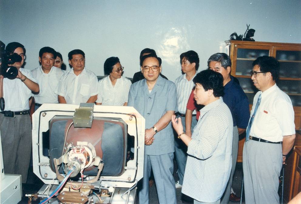 时任中央政治局委员、书记处书记、中宣部部长丁关根校友参观我校电子物理与器件研究所(1992年)