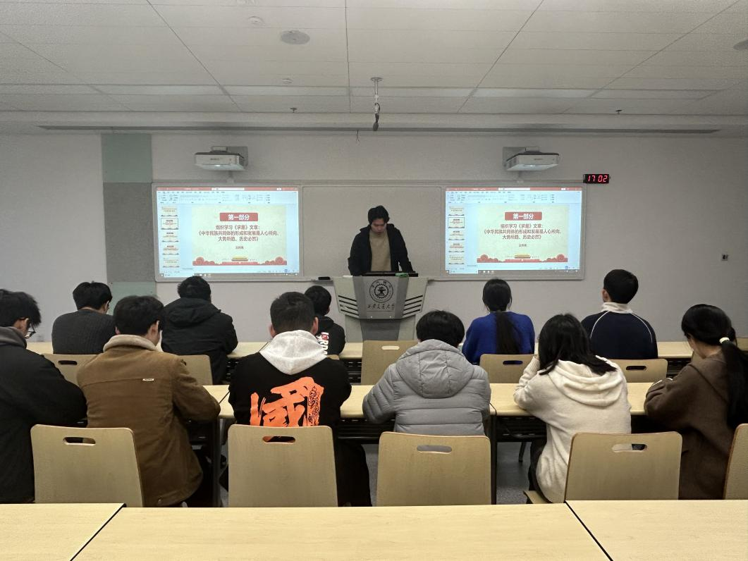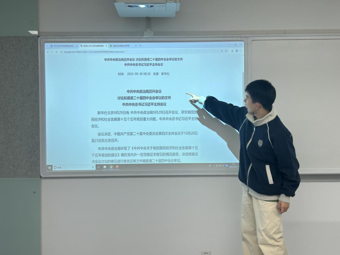 郭明同志对党的第二十届四中全会召开情况进行了介绍,重点解读了《中共中央关于制定国民经济和社会发展第十五个五年规划的建议》及往届四中全会通过的重要文件,使支部成员对国家的发展规划和战略布局有了更清晰的认识。他详细讲解了“十五五”时期经济社会发展方面的六个“坚持”,并明确了学生党员需要做到:对标 “坚持党的全面领导”:筑牢思想根基,做好政策宣传员;对标 “坚持人民至上”:聚焦身边需求,做好服务贴心人;对标 “坚持高质量发展”:深耕学业科研,争做创新排头兵;对标 “坚持全面深化改革、扩大高水平开放”:拓宽视野格局,争当交流推动者;对标 “坚持有效市场和有为政府相结合”:树立正确认知,做好实践参与者;对标 “坚持统筹发展和安全”:强化责任意识,做好安全守护者。立足学生身份,把理论要求转化为学习、实践和服务的具体行动,既做好自身表率,也带动身边群体共同进步。