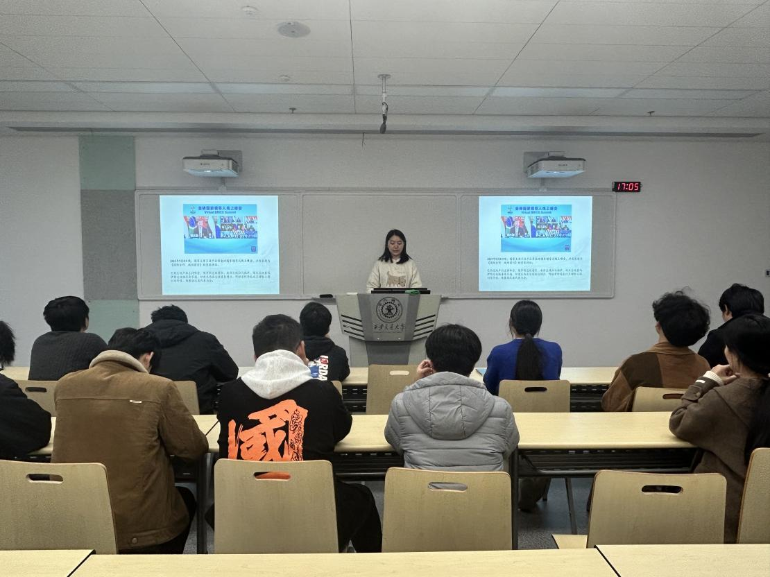 刘晨舒同志组织支部成员学习了习近平总书记在金砖国家领导人线上峰会的重要讲话,让大家深入了解到习近平总书记所提出的全球治理倡议体现了和平发展的核心理念,为推动全球治理体系改革提供了公正、可持续的新路径,并将引领国际社会凝聚共识、深化合作。同时,她提到学生党员需胸怀“国之大者”,从金砖精神、全球治理倡议中汲取“开放包容、合作共赢”的成长养分,明确新时代青年使命:关注国际议题,理性看待全球治理,提升国际视野;坚持开放共赢,以开放心态学习他人长处,积极参与国际交流、跨学科合作,在团队中学会包容协作;坚持团结合作,凝聚集体力量服务社会。