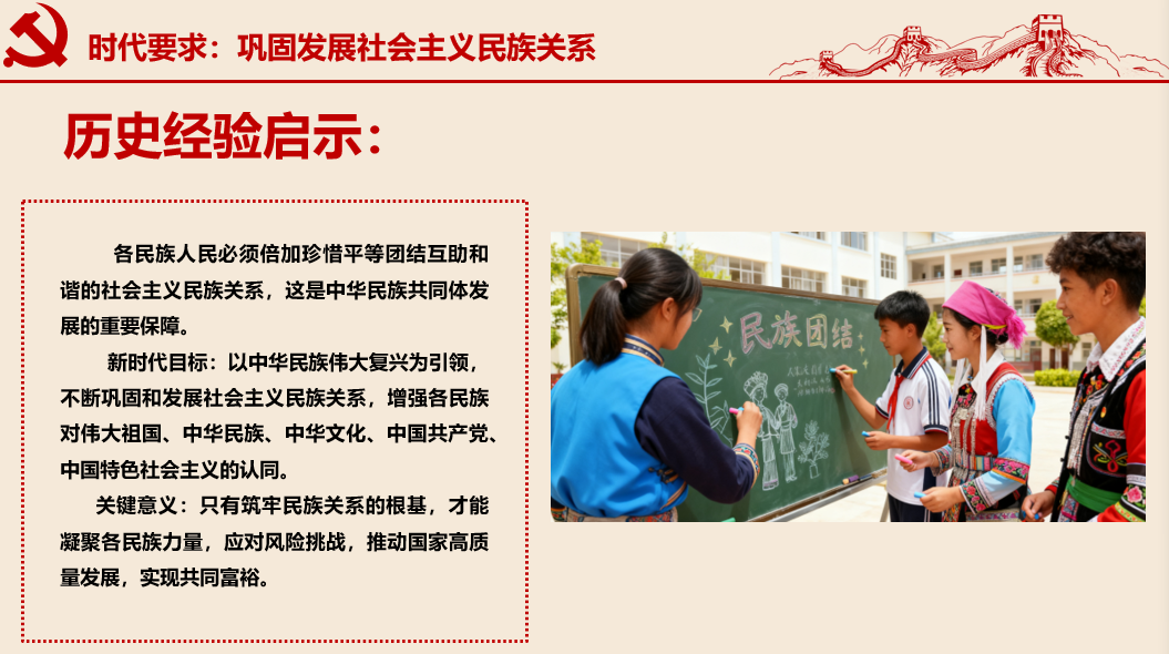 首先,李蕙廷同学为我们带来“中华民族共同体的形成与发展”的相关学习,李蕙廷同学从历史脉络出发,讲述了中华民族共同体形成与发展,中华民族五千多年文明史,各民族共同缔造统一的多民族国家,中华民族共同体的形成是人心所向、大势所趋、历史必然。李蕙廷同学进一步分享了中华民族共同体的核心内涵——“五个共同”。中华民族共同开拓了祖国的辽阔疆域,共同缔造了统一的多民族国家,共同书写了辉煌的中国历史,共同创造了灿烂的中华文化,共同培育了伟大的民族精神;李蕙廷同学讲到历史经验告诉我们:各族人民都要倍加珍惜、不断巩固和发展平等团结互助和谐的社会主义民族关系,不断夯实中华民族共同体建设的人心基础。只有筑牢民族关系的根基,才能凝聚各民族力量,应对风险挑战,推动国家高质量发展,实现共同富裕。