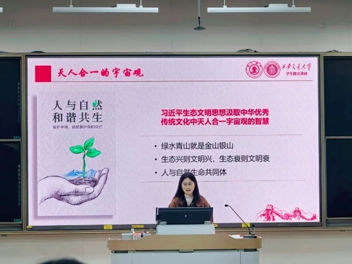 宣讲团成员从“天人合一的宇宙观”切入,深入阐述了人与自然的和谐互生理念。引用孟子、庄子等经典论述,为团员们展现了中华优秀传统文化中关于人与自然关系的深刻智慧,引导大家从传统文化中汲取思想养分,树立正确的自然观与发展观。